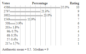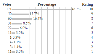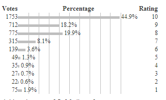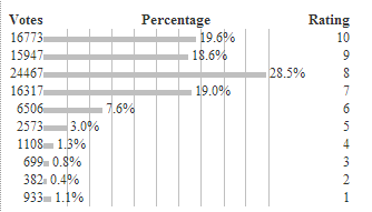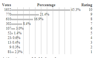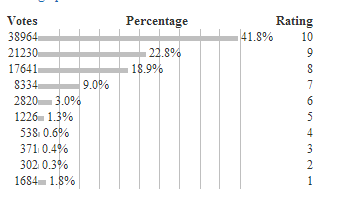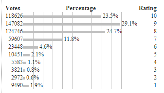 فیلمهای ایرانی بطور جالبی امتیازهای تقریبا یکسانی از کاربران گرفتهاند و الگوی نمودار آنها بسیار به هم نزدیک است، فیلمهای ایرانی دیگری را هم میتوانید با نمودارهای این شکلی در سایت بیابید، احتمالا با این فرض که بیشتر کاربرانی که به این فیلمها رای دادهاند ایرانی بودهاند موافقید، و با توجه به نمودارها میتوان ادعا کرد کاربران ایرانی به خیلی از فیلمهای ایرانی بطور احساسی ۱۰ میدهند، این یک چیز بدیهی بود ولی خوب خواستم با نمودار نشانش دهم.